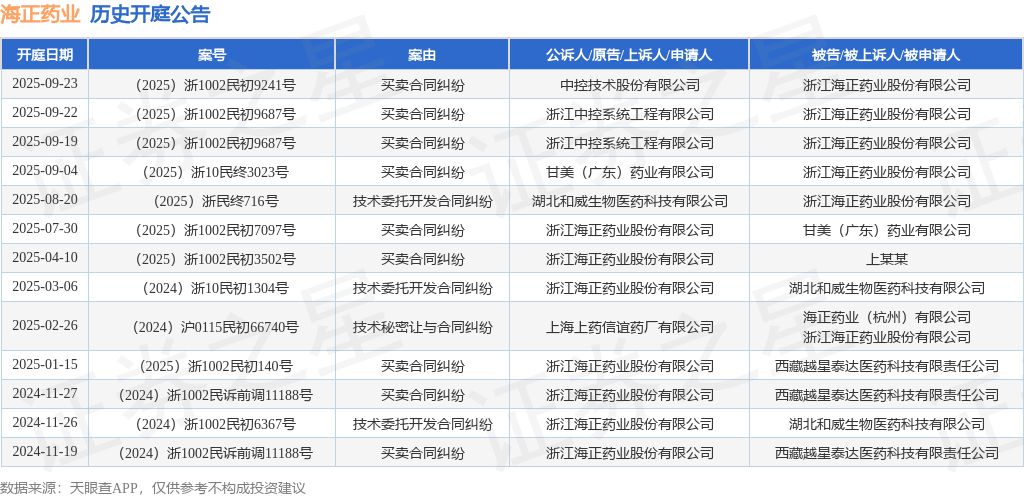案号:(2025)浙1002民初9241号根据统计,近一年内以浙江海正药业股份有限公司为当事人的历史开庭公告有13则,其中案由为“买卖合同纠纷”的公告以9则居首,其次为“技术委托开发合同纠纷”有3则,“技术秘密让与合同纠纷”有1则。历史开庭公告如下: