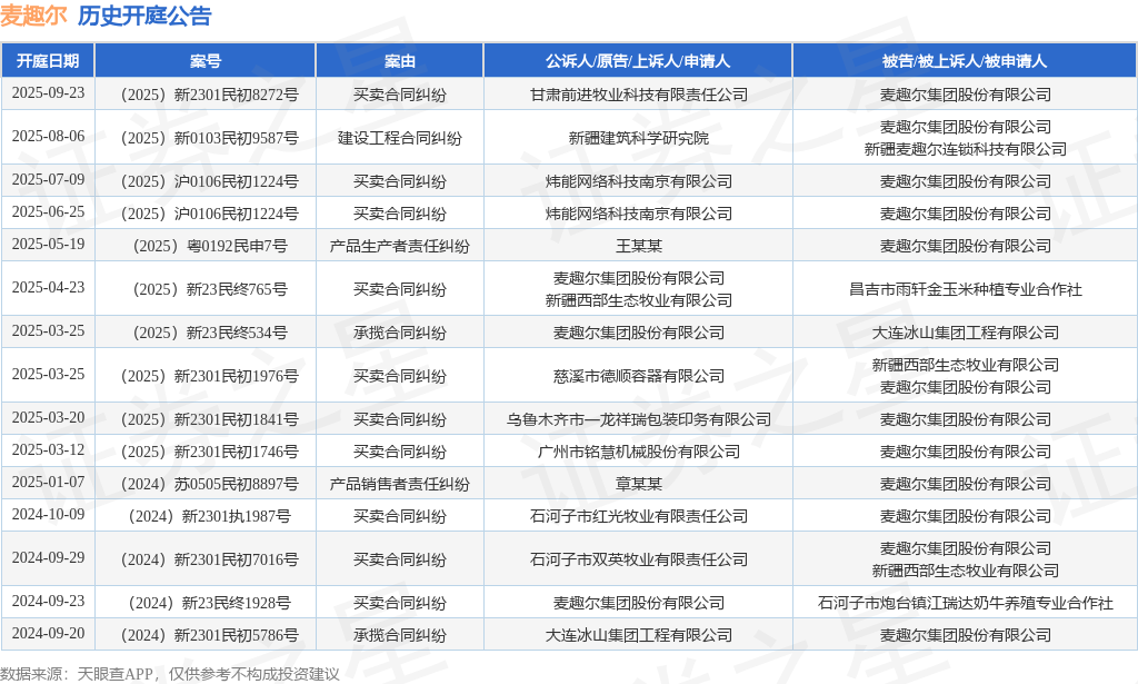 案号:(2025)新2301民初8272号根据统计,近一年内以麦趣尔集团股份有限公司为当事人的历史开庭公告有15则,其中案由为“买卖合同纠纷”的公告以10则居首,其次为“承揽合同纠纷”有2则,“产品生产者责任纠纷”有1则。历史开庭公告如下: