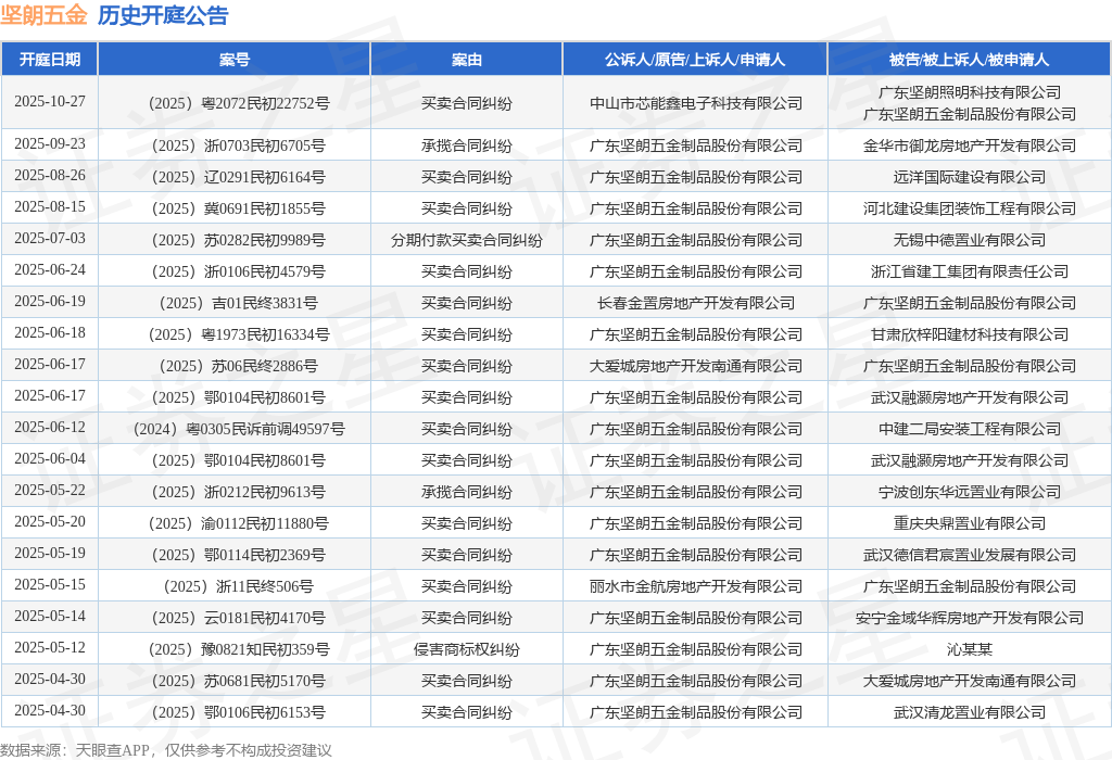 案号:(2025)浙0703民初6705号根据统计,近一年内以广东坚朗五金制品股份有限公司为当事人的历史开庭公告有75则,其中案由为“买卖合同纠纷”的公告以51则居首,其次为“票据追索权纠纷”有11则,“承揽合同纠纷”有3则。历史开庭公告(前20条)如下: