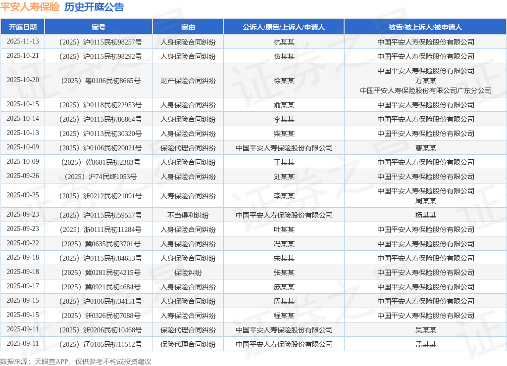 案号:(2025)沪0115民初59557号根据统计,近一年内以中国平安人寿保险股份有限公司为当事人的历史开庭公告有443则,其中案由为“人身保险合同纠纷”的公告以265则居首,其次为“保险纠纷”有44则,“人寿保险合同纠纷”有38则。历史开庭公告(前20条)如下: