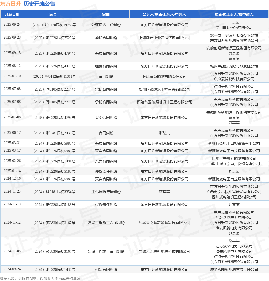 案号:(2025)浙0226民初7525号根据统计,近一年内以东方日升新能源股份有限公司为当事人的历史开庭公告有19则,其中案由为“买卖合同纠纷”的公告以6则居首,其次为“承揽合同纠纷”有3则,“侵权责任纠纷”有2则。历史开庭公告如下: