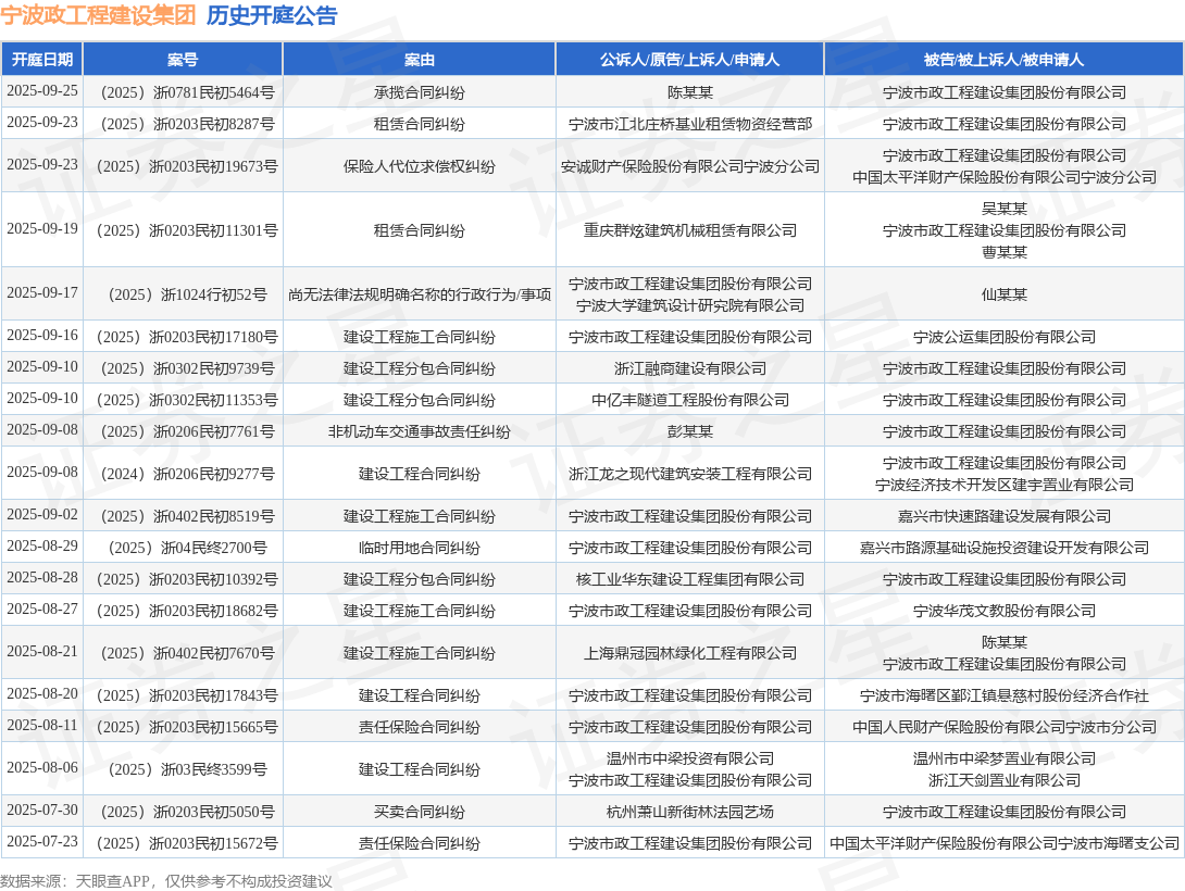 案号:(2025)浙0203民初19673号根据统计,近一年内以宁波市政工程建设集团股份有限公司为当事人的历史开庭公告有78则,其中案由为“建设工程施工合同纠纷”的公告以13则居首,其次为“建设工程合同纠纷”有9则,“买卖合同纠纷”有7则。历史开庭公告(前20条)如下: