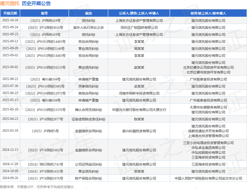 根据统计,近一年内以建元信托股份有限公司为当事人的历史开庭公告有18则,其中案由为“营业信托纠纷”的公告以3则居首,其次为“信托纠纷”有2则,“劳动合同纠纷”有2则。历史开庭公告如下:
