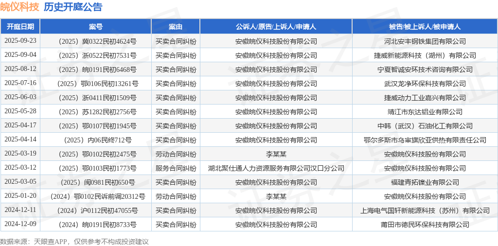 案号:(2025)冀0322民初4624号根据统计,近一年内以安徽皖仪科技股份有限公司为当事人的历史开庭公告有14则,其中案由为“买卖合同纠纷”的公告以11则居首,其次为“劳动合同纠纷”有2则,“服务合同纠纷”有1则。历史开庭公告如下: