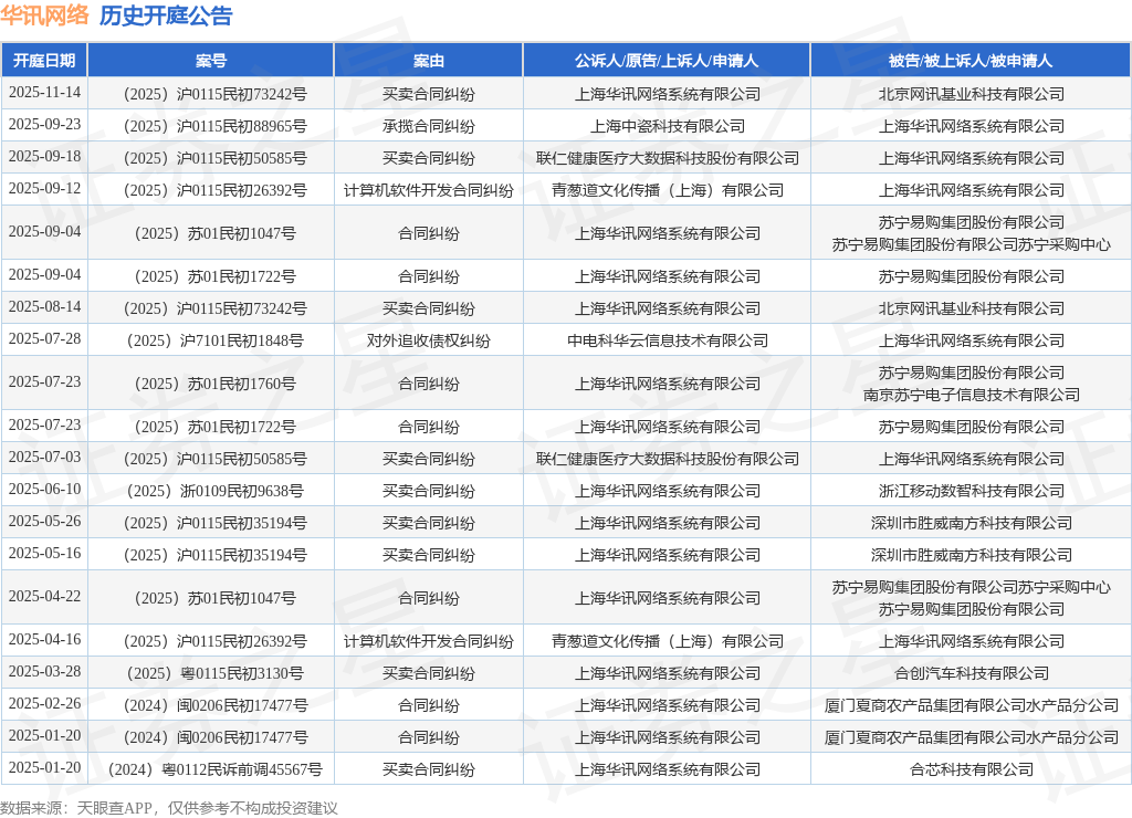 案号:(2025)沪0115民初88965号根据统计,近一年内以上海华讯网络系统有限公司为当事人的历史开庭公告有26则,其中案由为“买卖合同纠纷”的公告以11则居首,其次为“合同纠纷”有8则,“服务合同纠纷”有2则。历史开庭公告(前20条)如下: