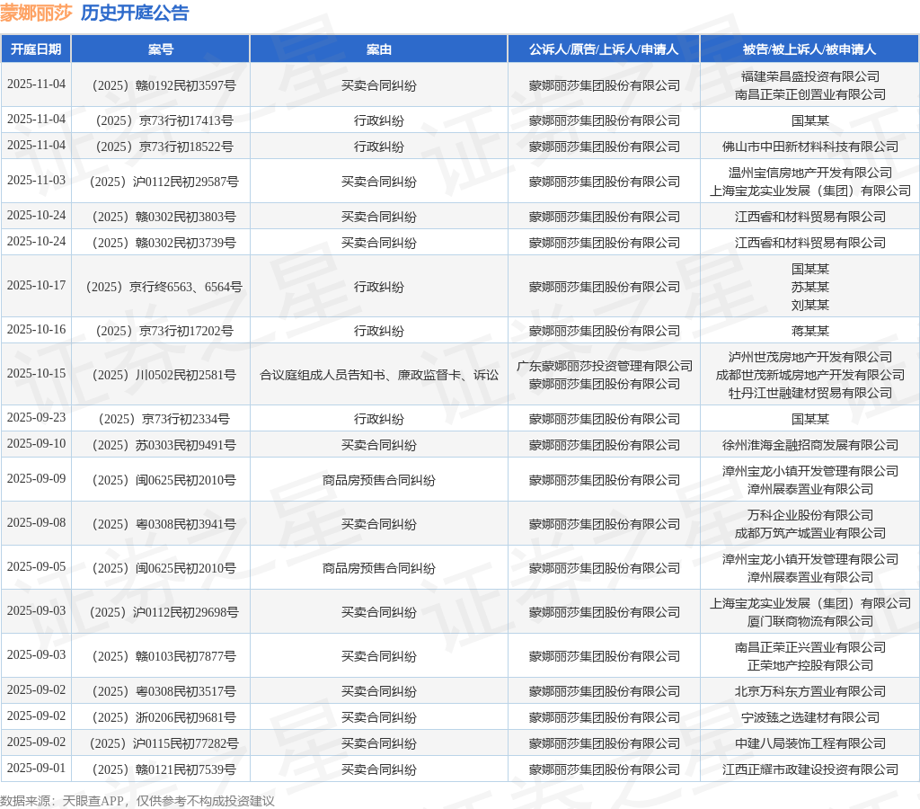 案号:(2025)京73行初2334号根据统计,近一年内以蒙娜丽莎集团股份有限公司为当事人的历史开庭公告有236则,其中案由为“买卖合同纠纷”的公告以158则居首,其次为“行政纠纷”有33则,“合同纠纷”有18则。历史开庭公告(前20条)如下: