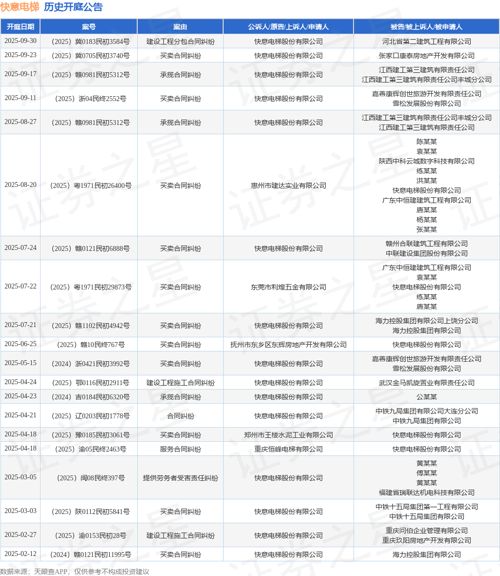 案号:(2025)冀0705民初3740号根据统计,近一年内以快意电梯股份有限公司为当事人的历史开庭公告有39则,其中案由为“买卖合同纠纷”的公告以20则居首,其次为“承揽合同纠纷”有5则,“服务合同纠纷”有5则。历史开庭公告(前20条)如下: