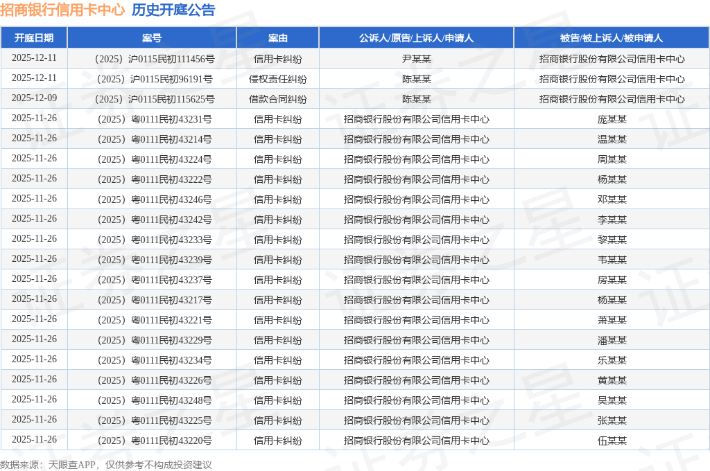 案号:(2025)沪0115民初92809号根据统计,近一年内以招商银行股份有限公司信用卡中心为当事人的历史开庭公告有13092则,其中案由为“信用卡纠纷”的公告以10611则居首,其次为“金融借款合同纠纷”有2279则,“合同纠纷”有85则。历史开庭公告(前20条)如下: