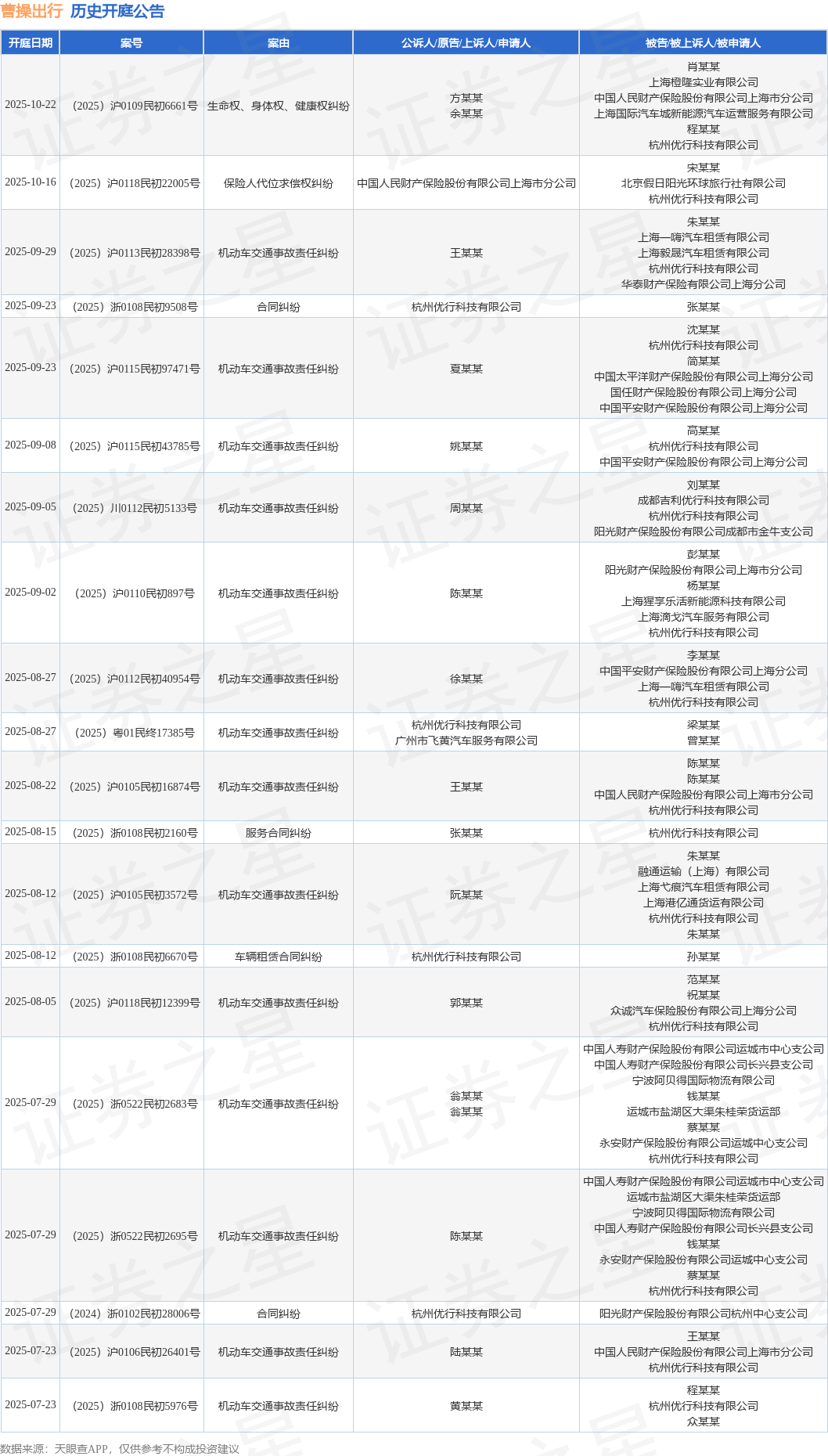 案号:(2025)沪0115民初97471号根据统计,近一年内以杭州优行科技有限公司为当事人的历史开庭公告有72则,其中案由为“机动车交通事故责任纠纷”的公告以45则居首,其次为“合同纠纷”有6则,“生命权、身体权、健康权纠纷”有4则。历史开庭公告(前20条)如下: