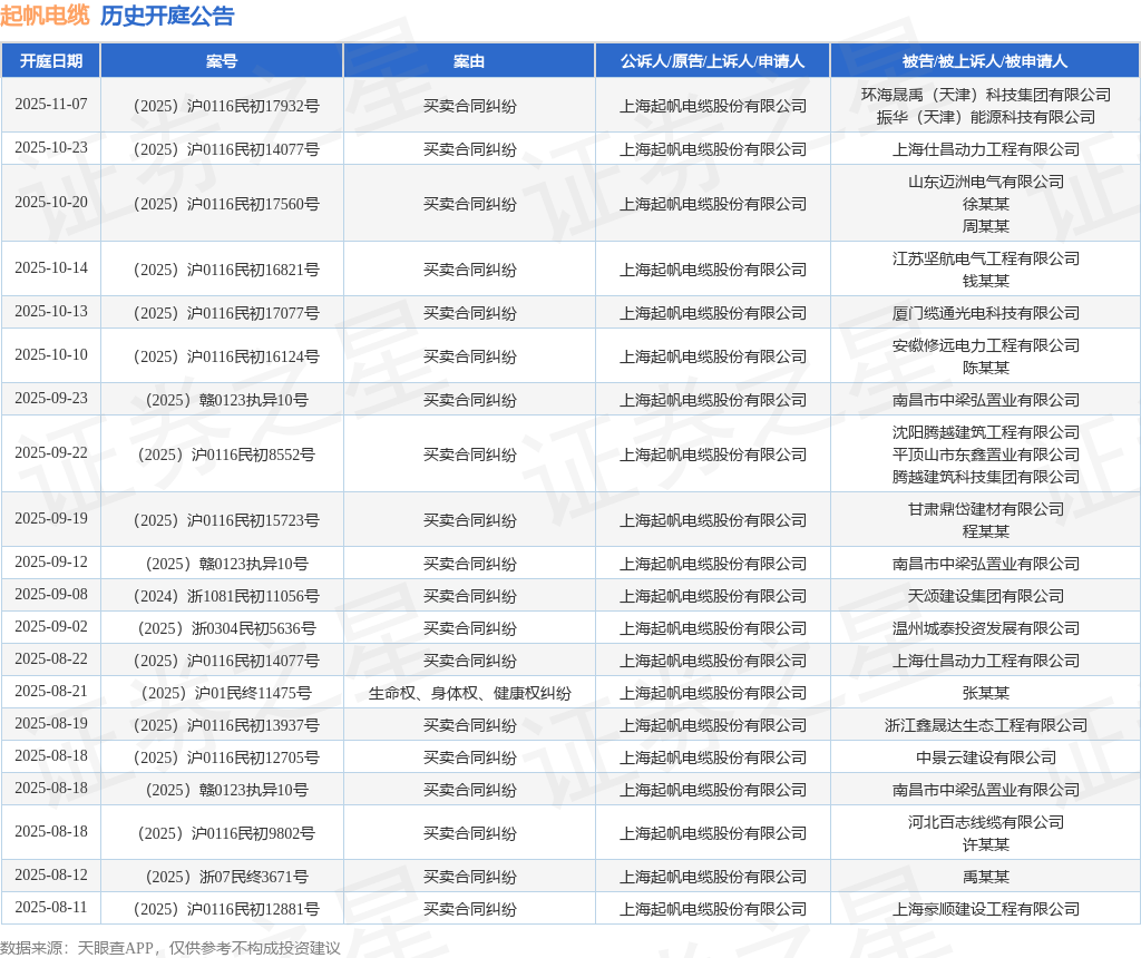 案号:(2025)赣0123执异10号根据统计,近一年内以上海起帆电缆股份有限公司为当事人的历史开庭公告有109则,其中案由为“买卖合同纠纷”的公告以95则居首,其次为“合同纠纷”有5则,“产品责任纠纷”有3则。历史开庭公告(前20条)如下: