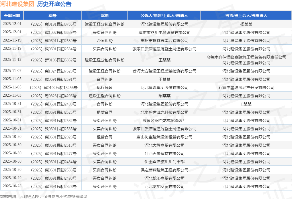 案号:(2025)冀0981民初4308号根据统计,近一年内以河北建设集团股份有限公司为当事人的历史开庭公告有1607则,其中案由为“买卖合同纠纷”的公告以646则居首,其次为“建设工程施工合同纠纷”有224则,“劳务合同纠纷”有125则。历史开庭公告(前20条)如下: