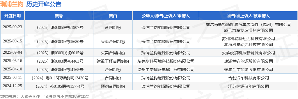 案号:(2025)浙0305民初1907号根据统计,近一年内以瑞浦兰钧能源股份有限公司为当事人的历史开庭公告有7则,其中案由为“合同纠纷”的公告以3则居首,其次为“买卖合同纠纷”有2则,“建设工程合同纠纷”有1则。历史开庭公告如下: