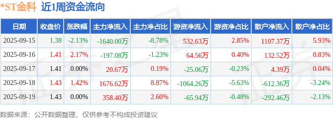 资金流向数据方面,本周*ST金科主力资金合计净流入218.61万元,游资资金合计净流出558.07万元,散户资金合计净流入339.46万元。本周资金流向一览见下表:
