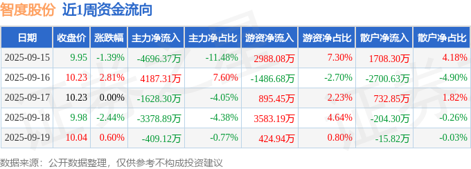 资金流向数据方面,本周智度股份主力资金合计净流出5925.36万元,游资资金合计净流入6404.96万元,散户资金合计净流出479.6万元。本周资金流向一览见下表: