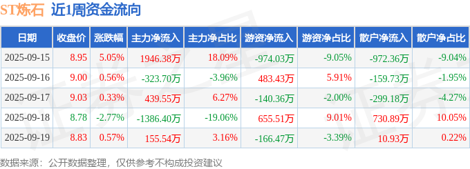 资金流向数据方面,本周ST炼石主力资金合计净流入831.37万元,游资资金合计净流出141.92万元,散户资金合计净流出689.45万元。本周资金流向一览见下表: