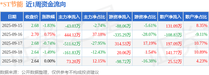 资金流向数据方面,本周*ST节能主力资金合计净流出199.16万元,游资资金合计净流出187.47万元,散户资金合计净流入386.63万元。本周资金流向一览见下表: