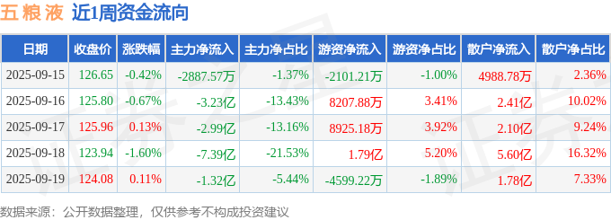 资金流向数据方面,本周五 粮 液主力资金合计净流出15.23亿元,游资资金合计净流入2.83亿元,散户资金合计净流入12.4亿元。本周资金流向一览见下表: