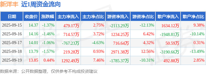 资金流向数据方面,本周新洋丰主力资金合计净流入1938.28万元,游资资金合计净流入1023.59万元,散户资金合计净流出2961.87万元。本周资金流向一览见下表:
