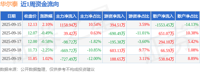 资金流向数据方面,本周华尔泰主力资金合计净流出297.56万元,游资资金合计净流入300.42万元,散户资金合计净流出2.86万元。本周资金流向一览见下表: