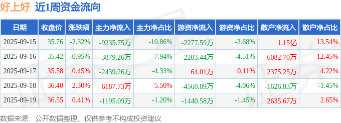 资金流向数据方面,本周好上好主力资金合计净流出1.06亿元,游资资金合计净流出1.04亿元,散户资金合计净流入2.1亿元。本周资金流向一览见下表: