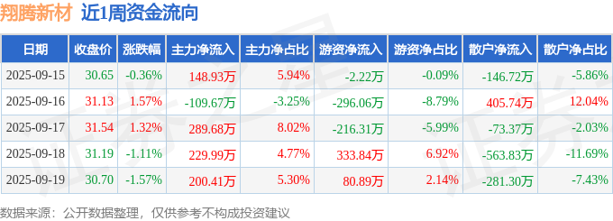 资金流向数据方面,本周翔腾新材主力资金合计净流入759.34万元,游资资金合计净流出99.85万元,散户资金合计净流出659.49万元。本周资金流向一览见下表: