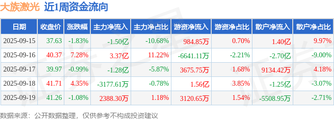 资金流向数据方面,本周大族激光主力资金合计净流入5110.7万元,游资资金合计净流入1.68亿元,散户资金合计净流出2.19亿元。本周资金流向一览见下表: