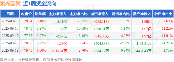 资金流向数据方面,本周紫光国微主力资金合计净流出4.33亿元,游资资金合计净流出1274.21万元,散户资金合计净流入4.46亿元。本周资金流向一览见下表:
