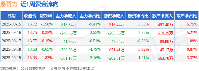 资金流向数据方面,本周易普力主力资金合计净流出2260.41万元,游资资金合计净流入453.88万元,散户资金合计净流入1806.53万元。本周资金流向一览见下表: