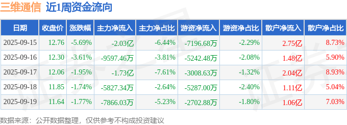 资金流向数据方面,本周三维通信主力资金合计净流出6.09亿元,游资资金合计净流出2.34亿元,散户资金合计净流入8.44亿元。本周资金流向一览见下表: