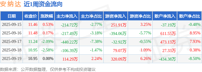 资金流向数据方面,本周安 纳 达主力资金合计净流出864.53万元,游资资金合计净流入224.09万元,散户资金合计净流入640.44万元。本周资金流向一览见下表: