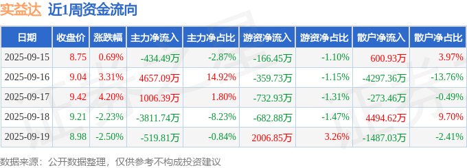 资金流向数据方面,本周实益达主力资金合计净流入897.44万元,游资资金合计净流入64.87万元,散户资金合计净流出962.3万元。本周资金流向一览见下表: