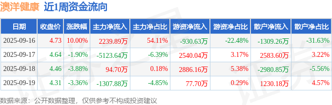 资金流向数据方面,本周澳洋健康主力资金合计净流出4096.94万元,游资资金合计净流入4573.27万元,散户资金合计净流出476.34万元。本周资金流向一览见下表: