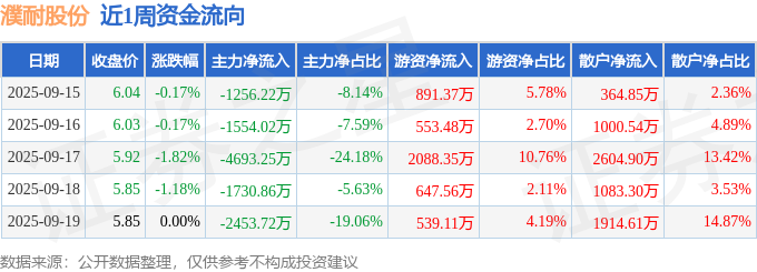 资金流向数据方面,本周濮耐股份主力资金合计净流出1.17亿元,游资资金合计净流入4719.88万元,散户资金合计净流入6968.19万元。本周资金流向一览见下表: