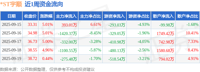 资金流向数据方面,本周*ST宇顺主力资金合计净流出2735.39万元,游资资金合计净流出2031.73万元,散户资金合计净流入4767.12万元。本周资金流向一览见下表: