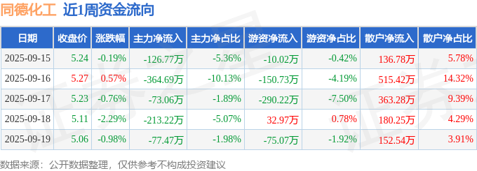 资金流向数据方面,本周同德化工主力资金合计净流出855.21万元,游资资金合计净流出493.07万元,散户资金合计净流入1348.28万元。本周资金流向一览见下表: