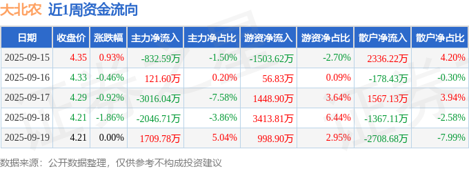 资金流向数据方面,本周大北农主力资金合计净流出4063.96万元,游资资金合计净流入4414.83万元,散户资金合计净流出350.87万元。本周资金流向一览见下表: