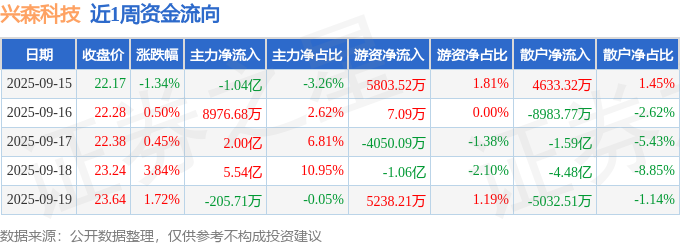 资金流向数据方面,本周兴森科技主力资金合计净流入7.38亿元,游资资金合计净流出3619.25万元,散户资金合计净流出7.01亿元。本周资金流向一览见下表: