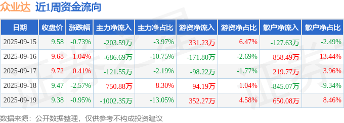 资金流向数据方面,本周众业达主力资金合计净流出1263.31万元,游资资金合计净流入507.66万元,散户资金合计净流入755.65万元。本周资金流向一览见下表:
