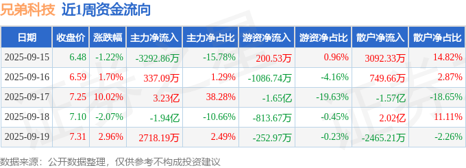 资金流向数据方面,本周兄弟科技主力资金合计净流入1.27亿元,游资资金合计净流出1.85亿元,散户资金合计净流入5840.31万元。本周资金流向一览见下表: