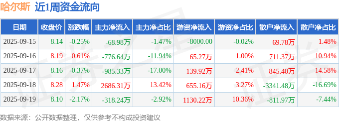 资金流向数据方面,本周哈尔斯主力资金合计净流入537.13万元,游资资金合计净流入1989.77万元,散户资金合计净流出2526.9万元。本周资金流向一览见下表: