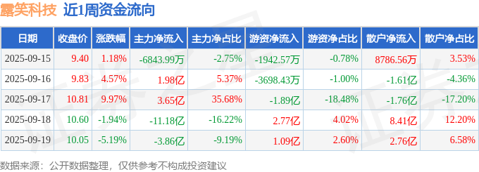 资金流向数据方面,本周露笑科技主力资金合计净流出10.09亿元,游资资金合计净流入1.41亿元,散户资金合计净流入8.69亿元。本周资金流向一览见下表: