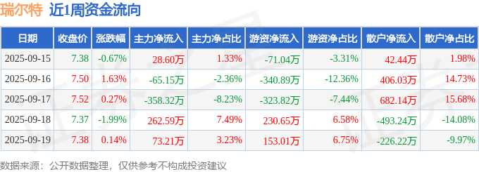 资金流向数据方面,本周瑞尔特主力资金合计净流出59.07万元,游资资金合计净流出352.1万元,散户资金合计净流入411.16万元。本周资金流向一览见下表: