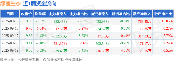 资金流向数据方面,本周绿茵生态主力资金合计净流出360.33万元,游资资金合计净流出929.12万元,散户资金合计净流入1289.44万元。本周资金流向一览见下表: