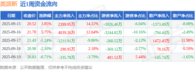 资金流向数据方面,本周英派斯主力资金合计净流入5182.47万元,游资资金合计净流出4419.4万元,散户资金合计净流出763.07万元。本周资金流向一览见下表: