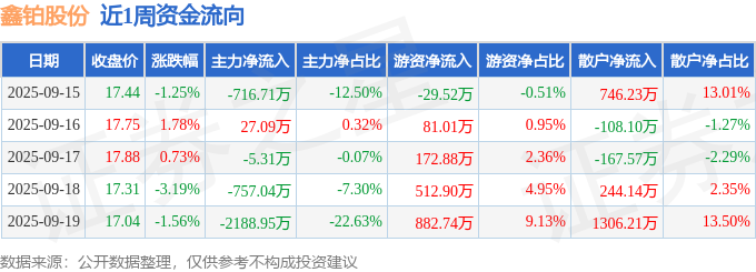 资金流向数据方面,本周鑫铂股份主力资金合计净流出3640.92万元,游资资金合计净流入1620.02万元,散户资金合计净流入2020.91万元。本周资金流向一览见下表: