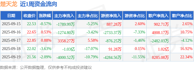 资金流向数据方面,本周楚天龙主力资金合计净流出1.4亿元,游资资金合计净流出6915.62万元,散户资金合计净流入2.09亿元。本周资金流向一览见下表: