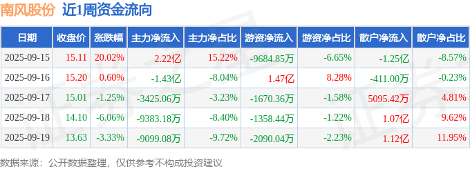 资金流向数据方面,本周南风股份主力资金合计净流出1.4亿元,游资资金合计净流出141.3万元,散户资金合计净流入1.41亿元。本周资金流向一览见下表: