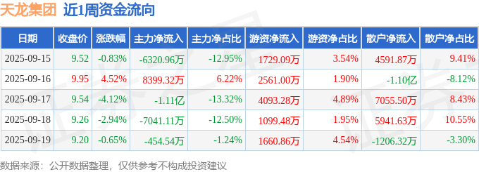 资金流向数据方面,本周天龙集团主力资金合计净流出1.66亿元,游资资金合计净流入1.11亿元,散户资金合计净流入5422.35万元。本周资金流向一览见下表:
