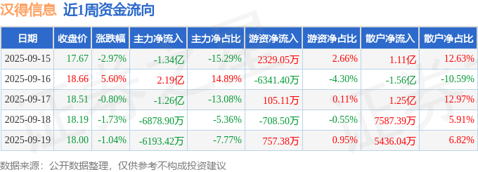 资金流向数据方面,本周汉得信息主力资金合计净流出1.71亿元,游资资金合计净流出3858.35万元,散户资金合计净流入2.1亿元。本周资金流向一览见下表:
