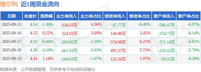 资金流向数据方面,本周维尔利主力资金合计净流入288.76万元,游资资金合计净流入1295.94万元,散户资金合计净流出1584.7万元。本周资金流向一览见下表: